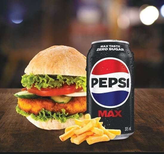 Panko chicken schnitzel burger, small chips and your choice of can flavour