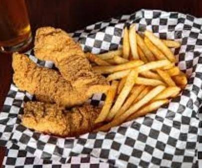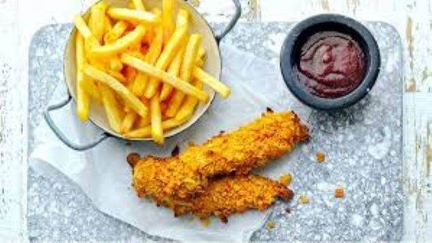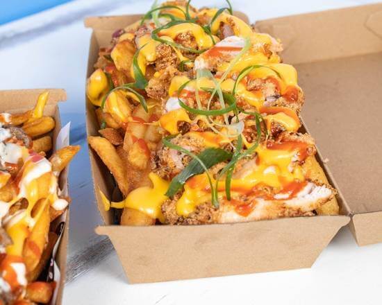 Golden fried crumbed chicken tenders on a bed of crispy chips, cheese sauce & sweet chilli sauce