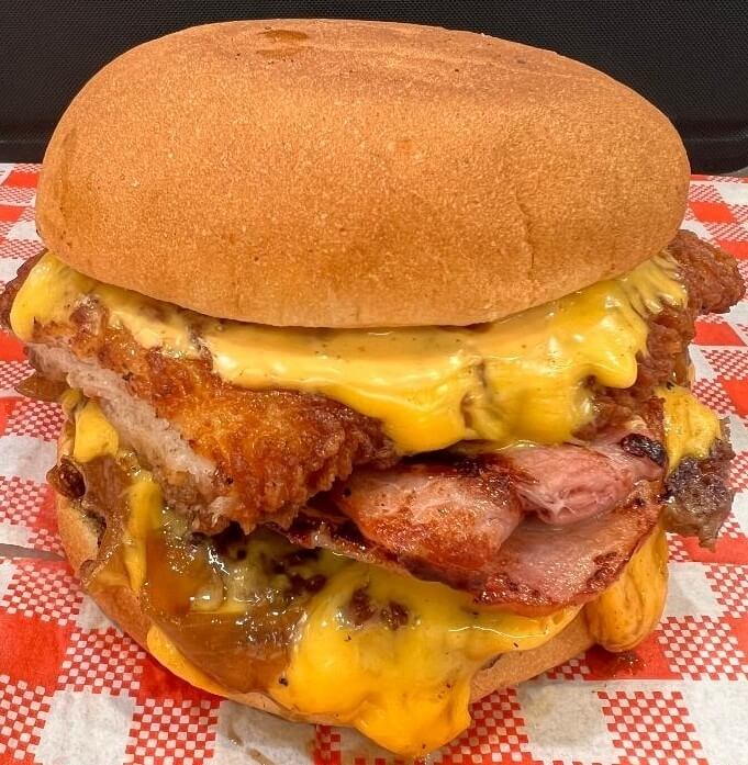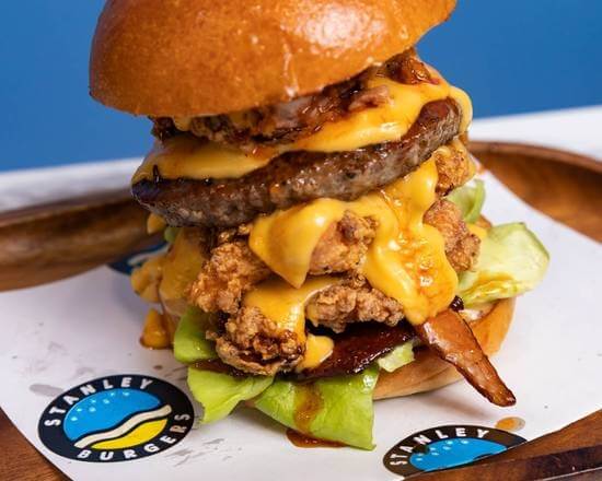 Beef, buttermilk fried chicken, american cheddar cheese, lettuce, aioli, sriracha bacon, onion rings and Stanley secret injector sauce