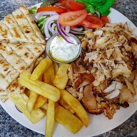 Choice of meat and sauce, green salad, crispy fries & pita bread
