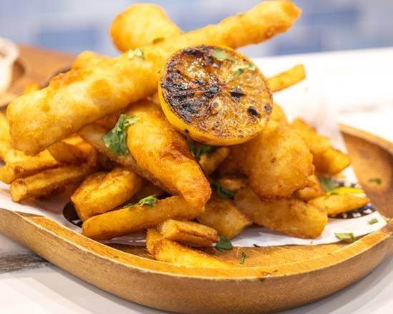 3 pieces flathead fillet beer battered, beer battered chips and lemon.
