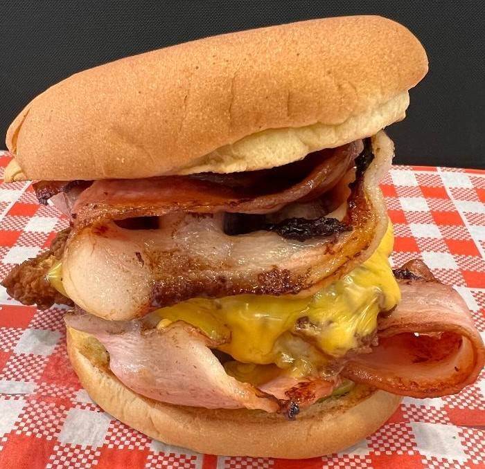 Beef, bacon, egg, onion, pineapple, BBQ, tomato, lettuce, beetroot, cheese & ketchup