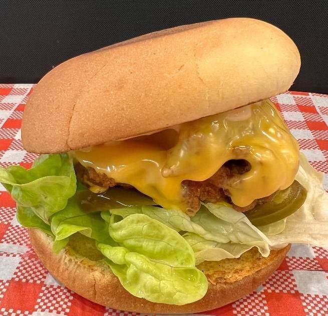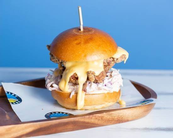 Plant based chicken patty, slaw, cheese. Tomato, onion & aioli