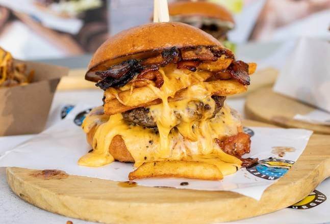 Homemade angus beef patty, American cheese, mac and cheese patty, sriracha bacon, caramelised onion, pickles and garlic aioli