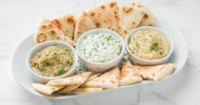A mixed of house made hummos, baba ghanouj & olives & feta dips, comes with pita bread