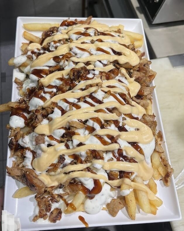 Chips, cheese sauce, souvlaki lamb, garlic sauce, sriracha sauce.